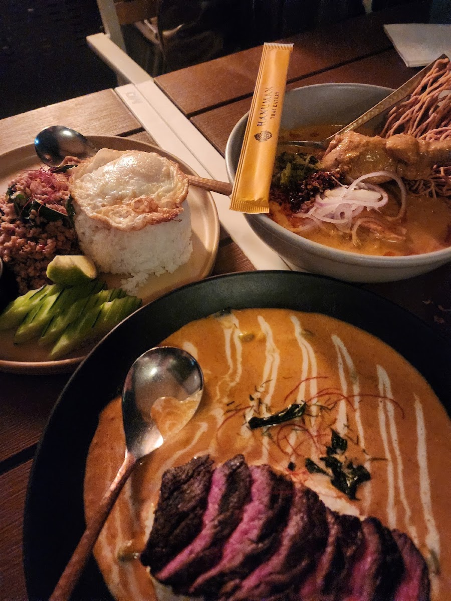 The menu at Hanuman Thai Eatery boasts a range of tantalizing dishes, with standout items sure to please even the most discerning palates. Try the Pad Thai Boran, a world-renowned dish lovingly prepared by skilled chefs, or opt for the Drunken Noodle—a flat rice noodle medley cooked to perfection with savory ingredients and a spicy garlic chili sauce that ignites your taste buds for just US$17.00. If you're a curry enthusiast, be sure to indulge in the creamy Massaman Curry or the flavorful Green Curry, each accompanied by fragrant rice for US$19.00.